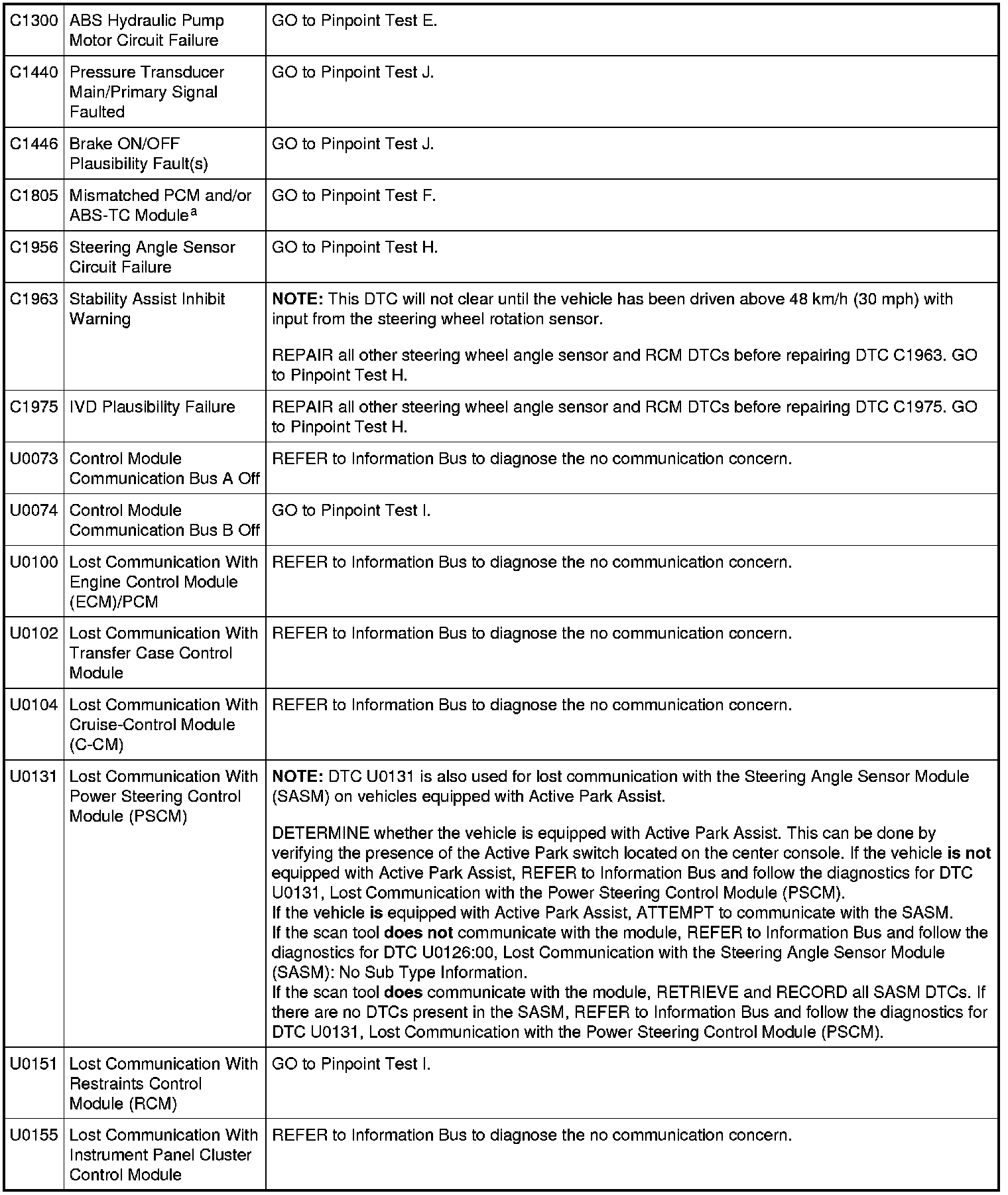 Steering Angle Sensor Module (SASM) DTC Chart
