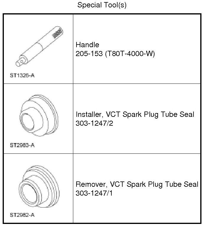 Using the VCT Spark Plug Tube Seal Installer and Handle, install new VCT solenoid and/or spark plug tube seals.