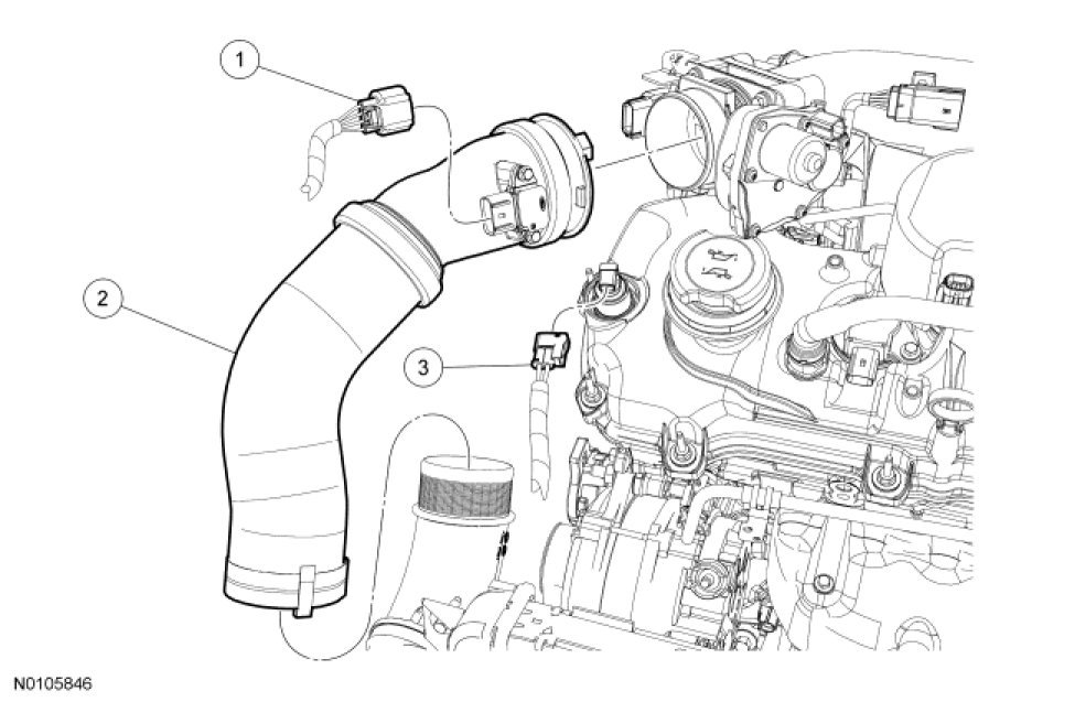 14. Connect the RH turbocharger bypass valve hose to the RH turbocharger intake tube.
