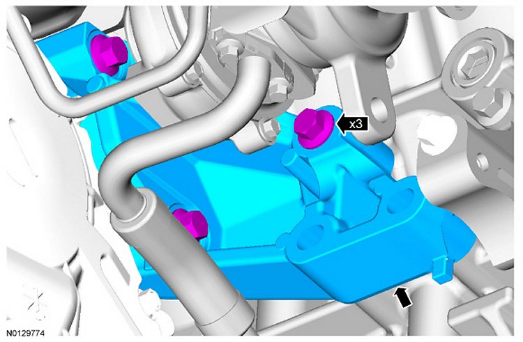 22. Install the RH turbocharger bracket and the 3 bolts.