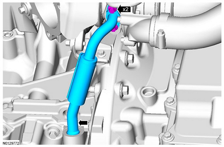 Using new O-ring seals and gasket, install the LH turbocharger oil return tube and the 2 bolts.