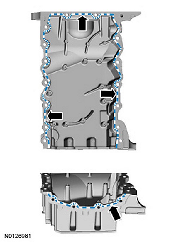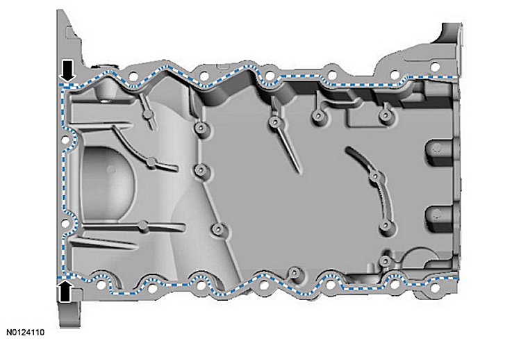 Apply a 3 mm (0.11 inch) bead of Motorcraft High Performance Engine RTV silicone to the sealing surface of the oil pan-to-engine block and to the oil pan-to-engine front cover mating surface.