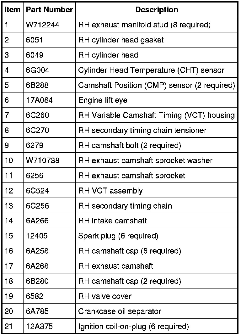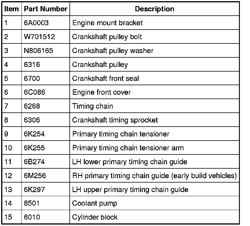 NOTE: On early build engines, the timing chain rides on the inner side of the RH timing chain guide. Late build engines are equipped with a different design RH timing chain guide that requires the timing chain to ride on the outer side of the RH timing chain guide. For service, all replacement RH timing chain guides will be the late build design.