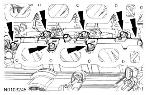 Install the 6 bolts and the LH fuel rail assembly.
