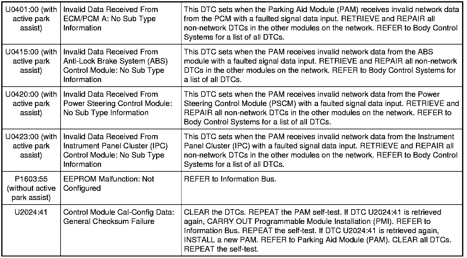 Parking Aid Module (PAM) DTC Chart