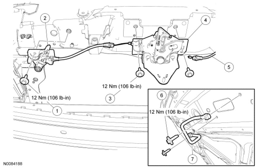 4. Disconnect the hood latch release cable and remove the hood latch.
