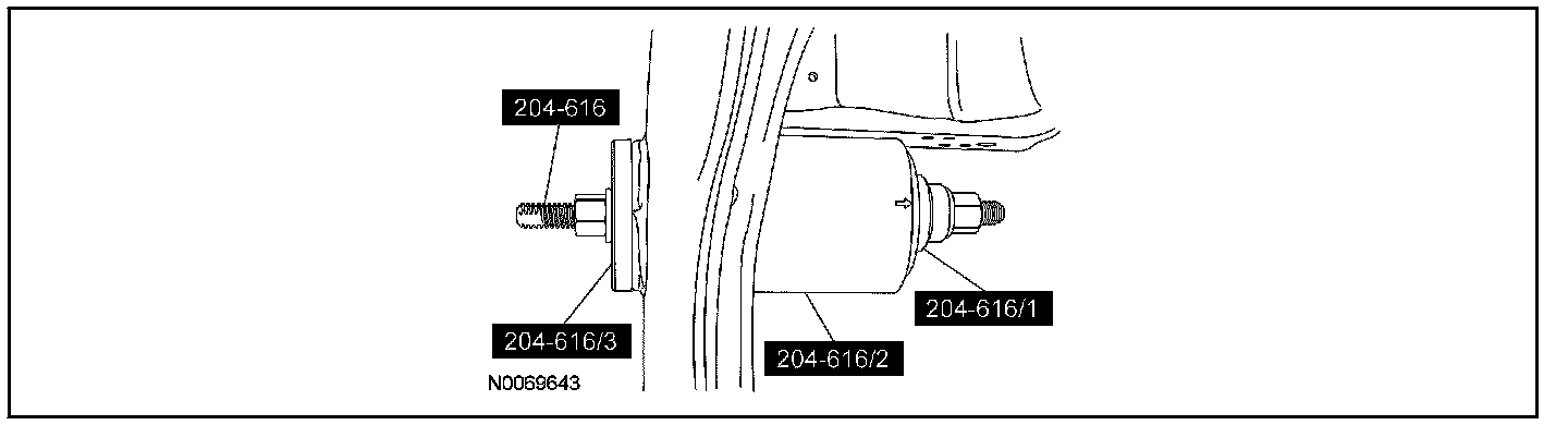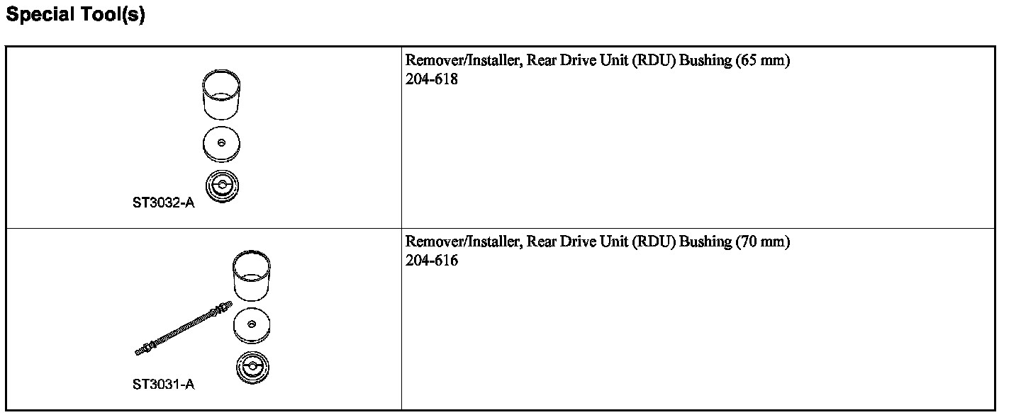 - When installing the RDU bushing, Rear Drive Unit (RDU) Bushing (70 mm) Remover/Installer 204-616/2 will fall away as the RDU bushing is installed into the subframe. The Rear Drive Unit (RDU) Bushing (70 mm) Remover/Installer does not control the depth of the bushing. The RDU bushing is fully seated when the Rear Drive Unit (RDU) Bushing (70 mm) Remover/Installer 204-616/3 and Rear Drive Unit (RDU) Bushing (70 mm) Remover/Installer 204-616/1 fall away from the subframe, do not continue to tighten the Rear Drive Unit (RDU) Bushing (70 mm) Remover/Installer.