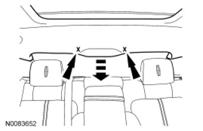 13. Pull down on the back of the headliner in the indicated positions to release the hidden fasteners from the body. Lower the headliner.