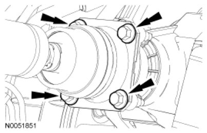 49. Line up the index marks on the rear driveshaft to the index marks on the PTU flange made during removal and install the 4 new bolts.