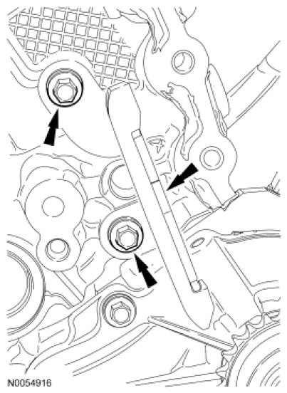 18. NOTE: The VCT bolt and the exhaust camshaft bolt must be discarded and new ones installed. However, the exhaust camshaft washer is reusable.