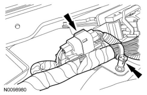 9. Detach the wiring harness retainer and disconnect the electrical connector.