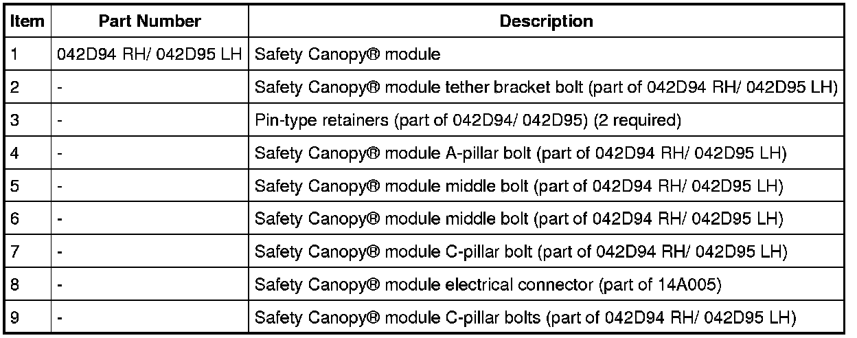 WARNING: Anytime the Safety Canopy(R) or side air curtain module has deployed, a new headliner and new A-, B- and C-pillar upper trim panels and attaching hardware must be installed. Remove any other damaged components and hardware and install new components and hardware as needed. Failure to follow these instructions may result in the Safety Canopy(R) or side air curtain module deploying incorrectly and increases the risk of serious personal injury or death in a crash.