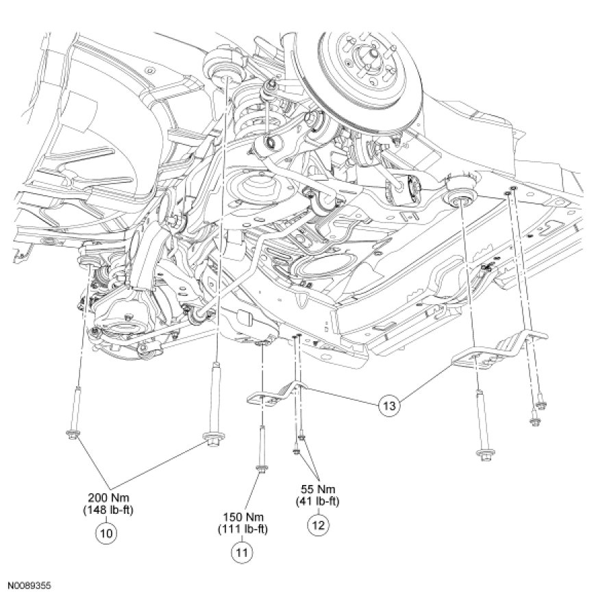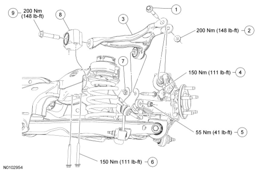 13. Tighten the upper arm-to-subframe forward bolt to 150 Nm (111 lb-ft).