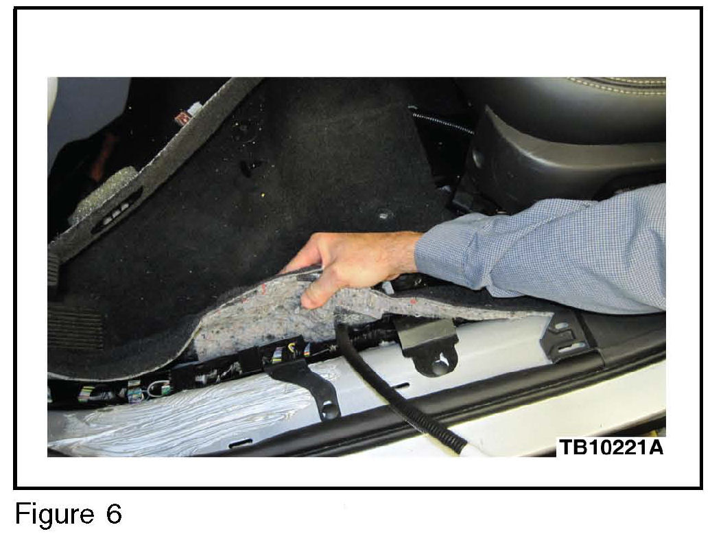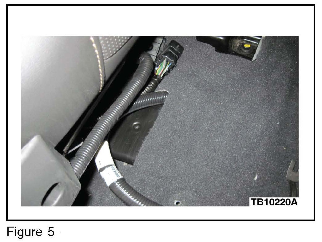 b. Continue routing under carpet, positioning along contour of the rear seat floor duct and exiting under the passenger front seat. (Figures 4 and 5)