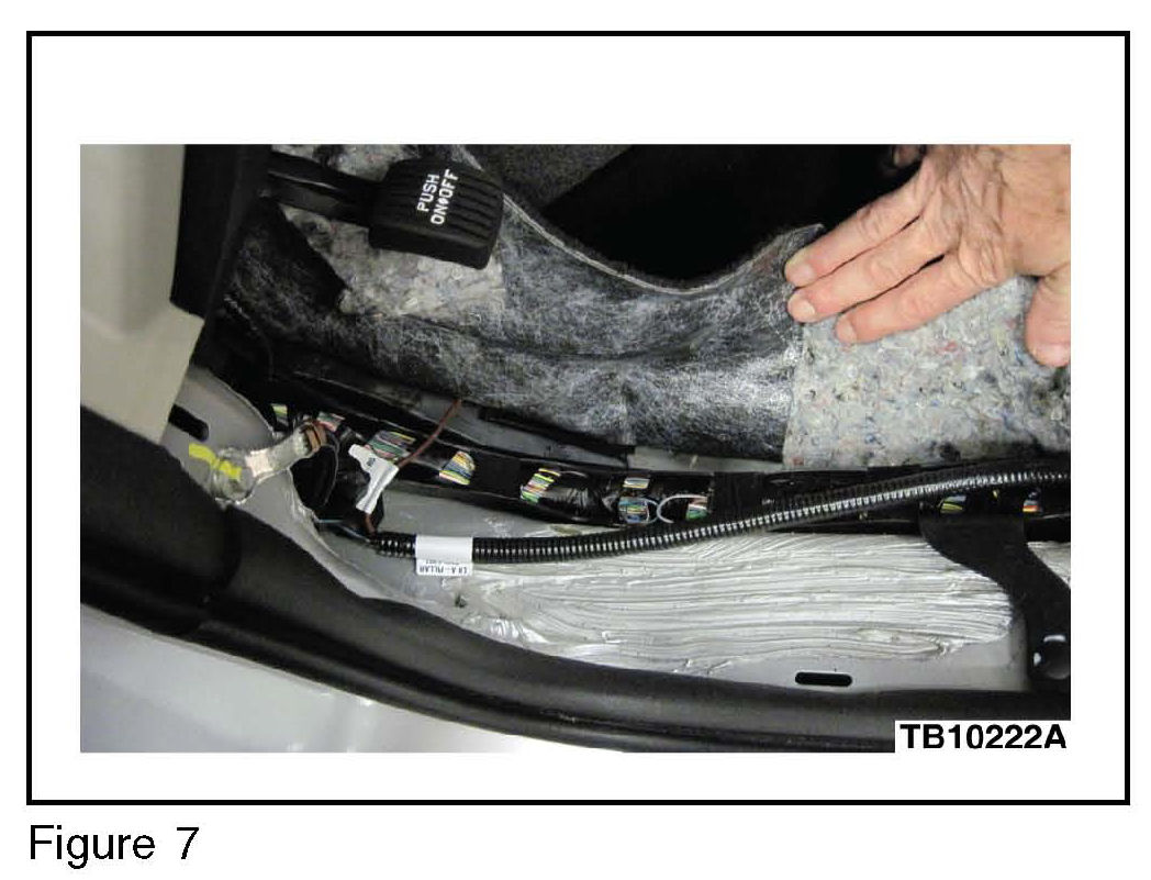 b. Then along side the main body harness 14A005 to the left hand lower A-pillar. (Figure 7)