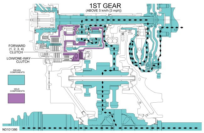 NOTE: The transaxle operates differently in 1st gear above and below 5 km/h (3 mph). For transaxle operation below 5 km/h (3 mph), refer to Manual LOW Position and 1st Gear Below 5 km/h (3 mph).
