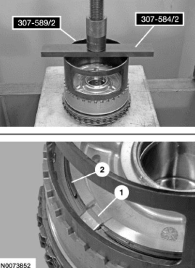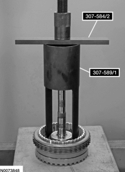 Install the Overdrive Clutch, Balance Piston and Direct Clutch Compressor 307-589/2 and the Forward/Intermediate Spring Compressor 307-584/2 on the direct clutch cylinder. Using a press, compress the direct clutch piston return spring, and remove the snap ring.
