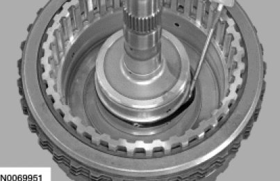 25. Position the overdrive/direct clutch assembly in the cover assembly, install the Dial Indicator Gauge with Holding Fixture 100-002 or a suitable dial indicator and position the plunger on the overdrive clutch pressure plate. Apply 483 kPa (70 psi) of air pressure to the overdrive clutch piston port while recording the clutch pack clearance on the Dial Indicator Gauge. The clearance should be between 1.13 mm (0.044 in) and 2.28 mm (0.089 in). If the clearance is out of range, check the overdrive clutch pack for correct installation. If the overdrive clutch pack is correctly installed, install a new overdrive clutch pack.
