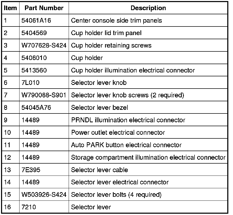 1. Remove the selector lever knob and bezel. For additional information, refer to Selector Lever Bezel Selector Lever Bezel and Selector Lever Knob Selector Lever Knob.