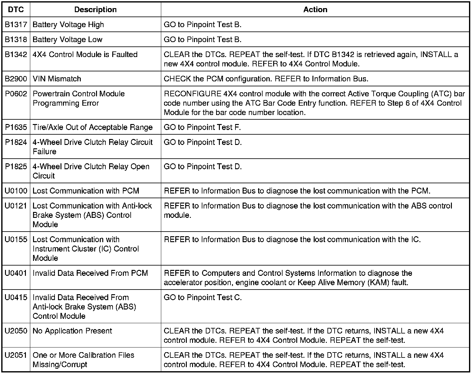 4X4 Control Module DTC Chart