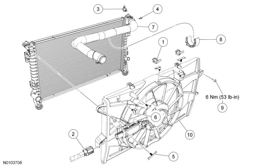 7. Detach the upper radiator hose from the cooling fan motor and shroud.