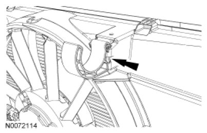 6. Detach the hood release cable retainer from the cooling fan motor and shroud.