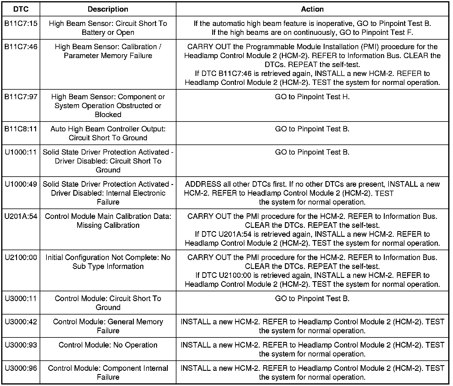 Headlamp Control Module 2 (HCM-2) DTC Chart