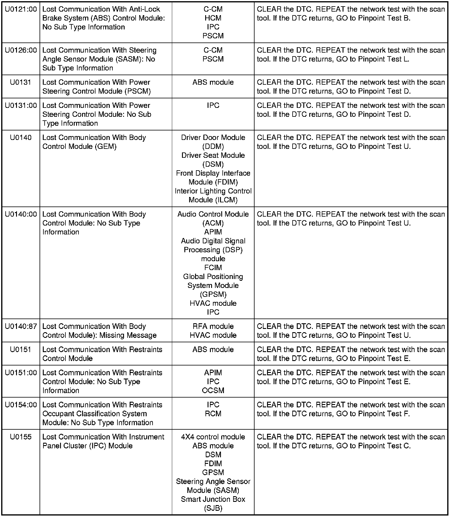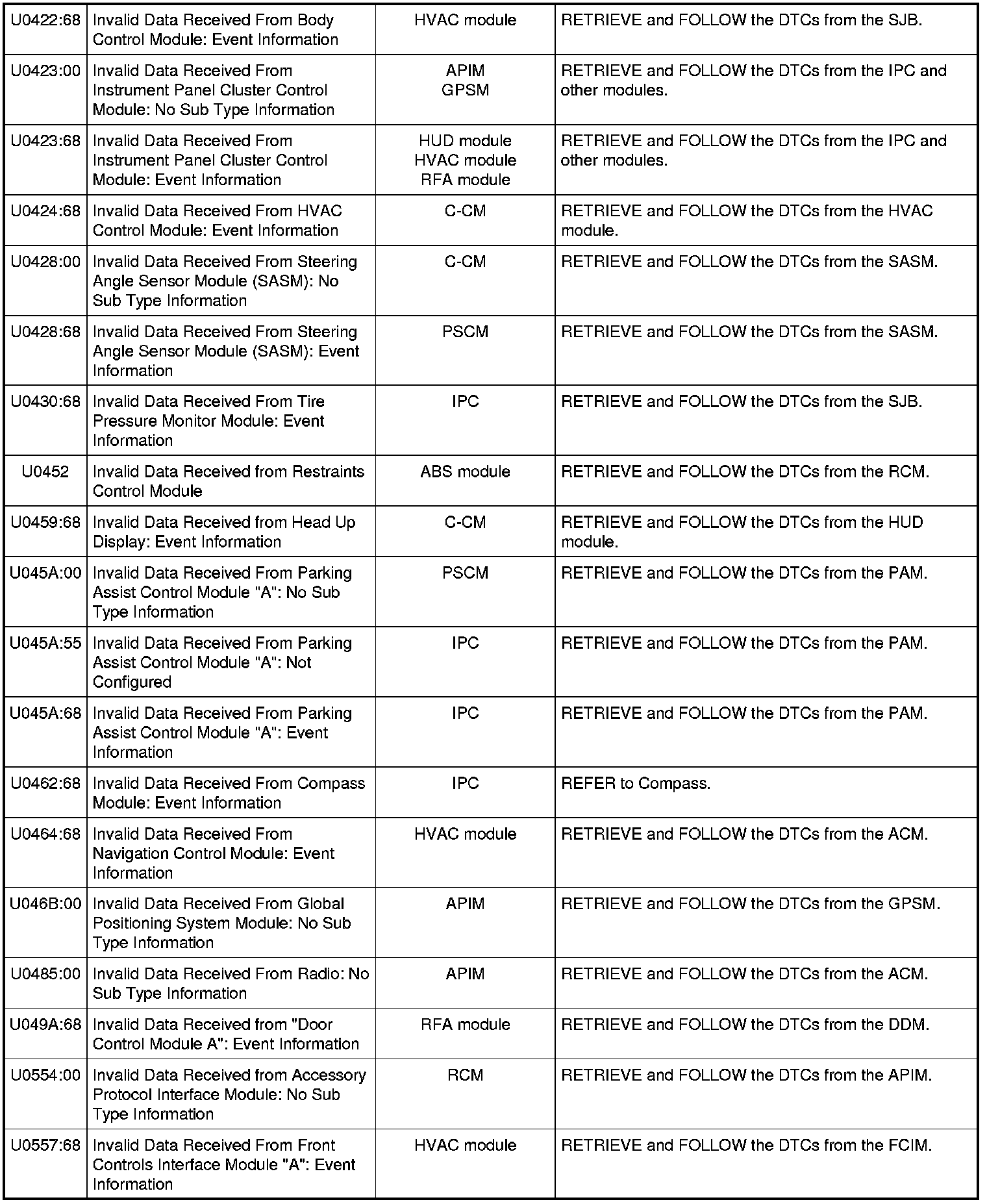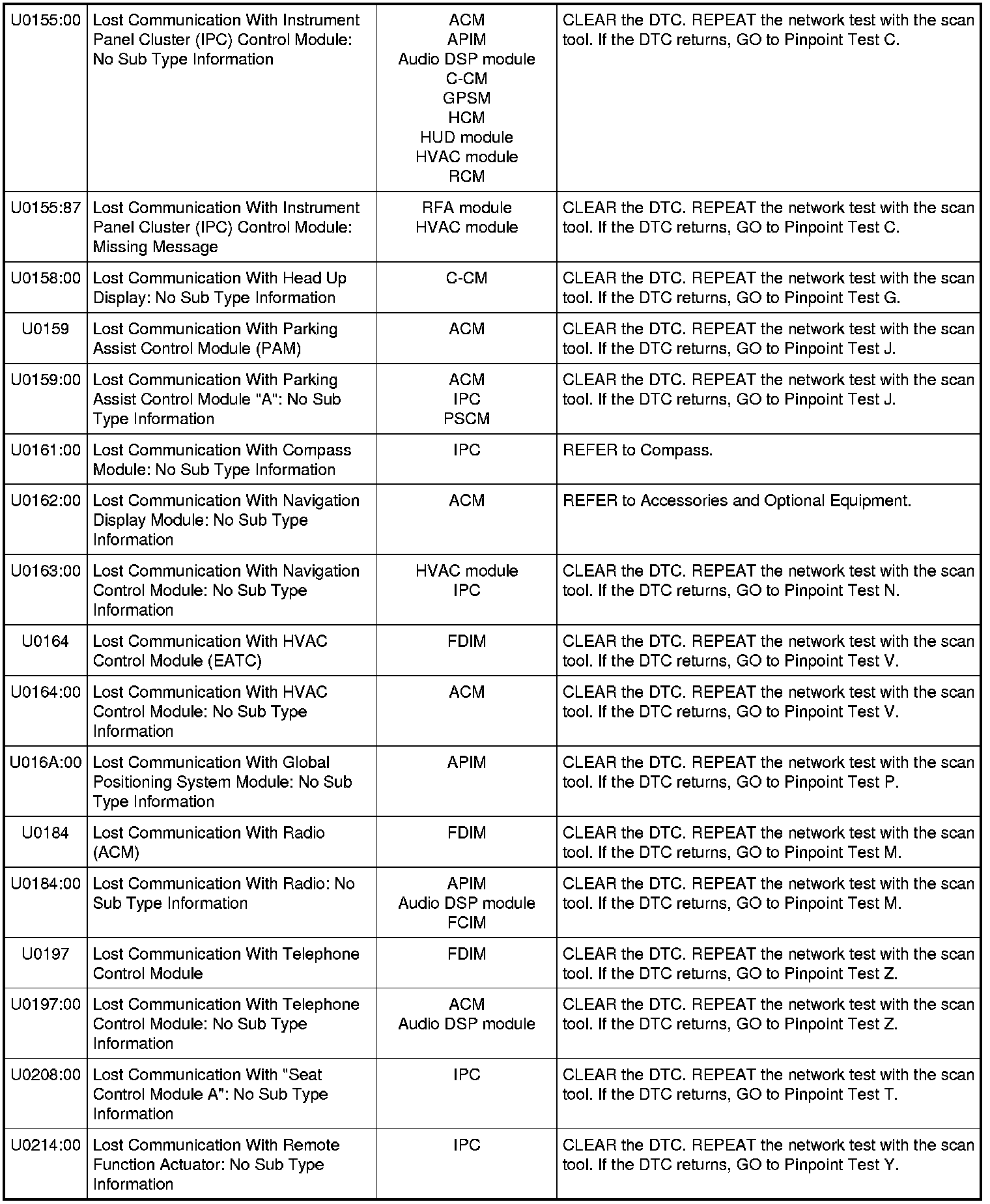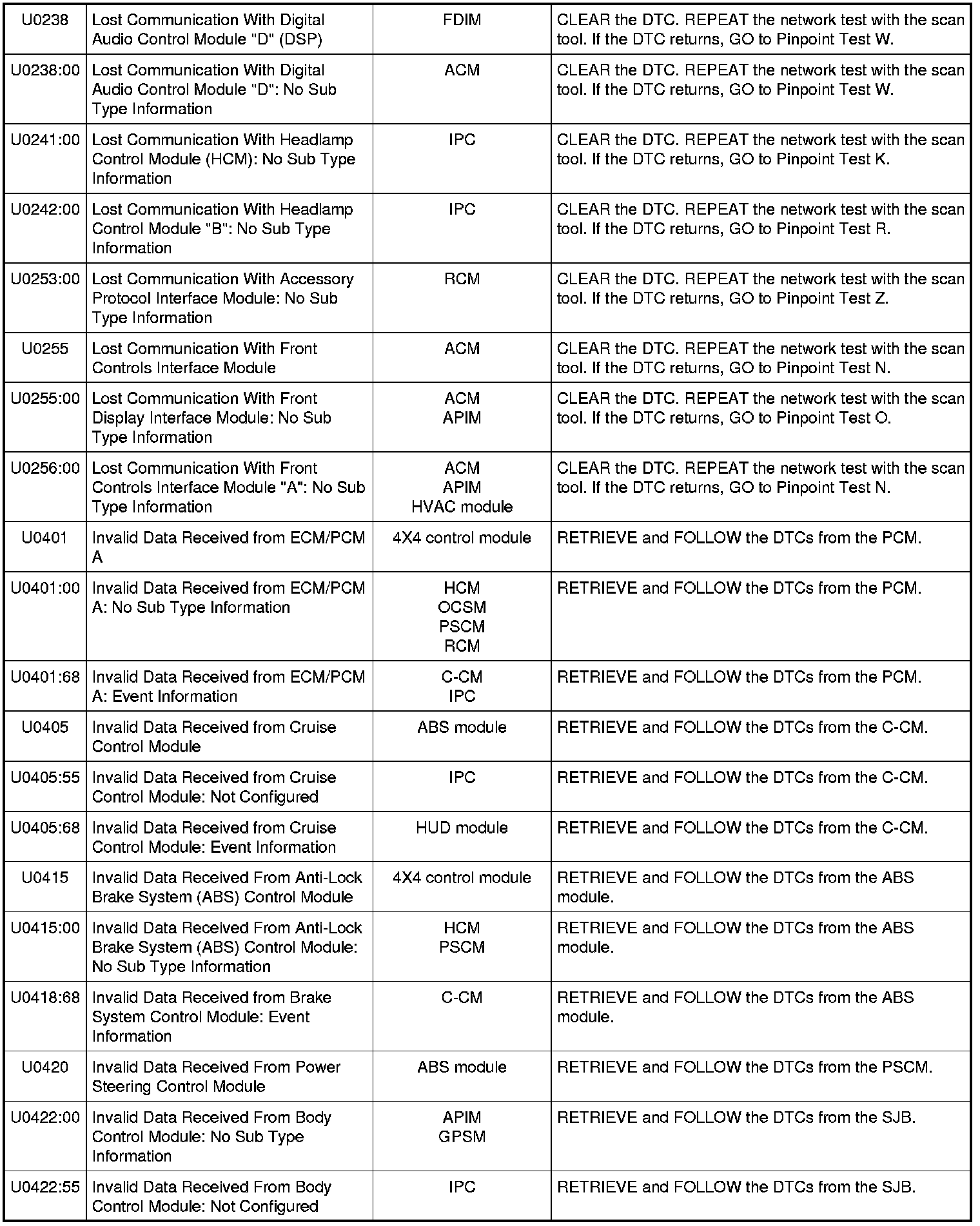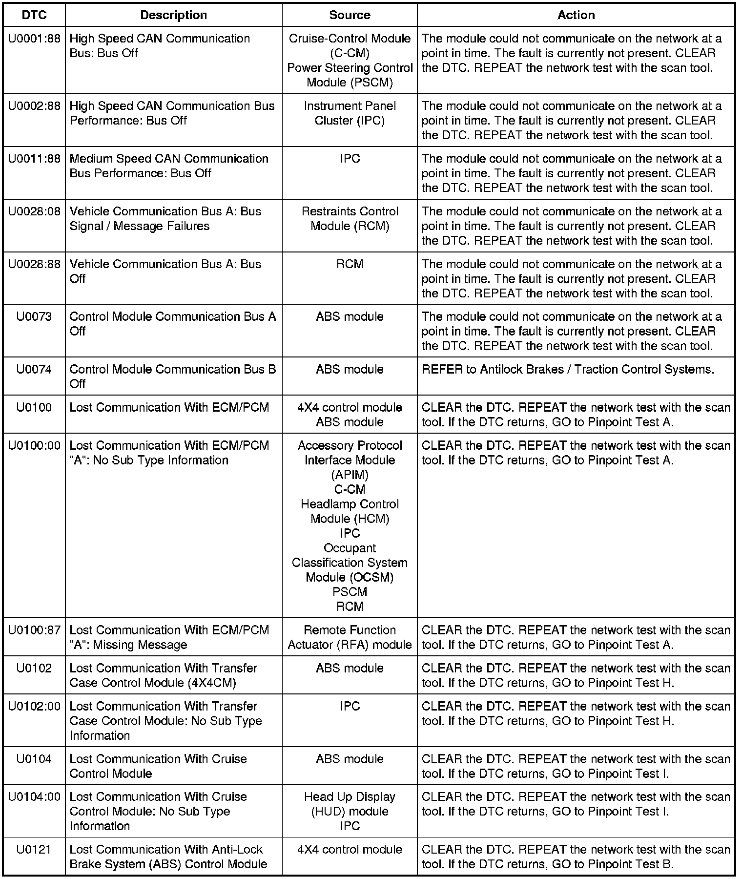 NOTE: Network DTCs (U-codes) are often a result of intermittent concerns such as faulty wiring or low battery voltage occurrences. Additionally, vehicle service procedures such as module reprogramming often sets network DTCs. Replacing a module to resolve a network DTC is unlikely to resolve the concern. To prevent repeat network DTC concerns, inspect all network wiring, especially connectors. Test the vehicle battery, refer to Battery.