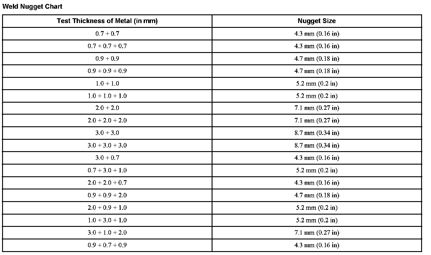 Weld Nugget Chart