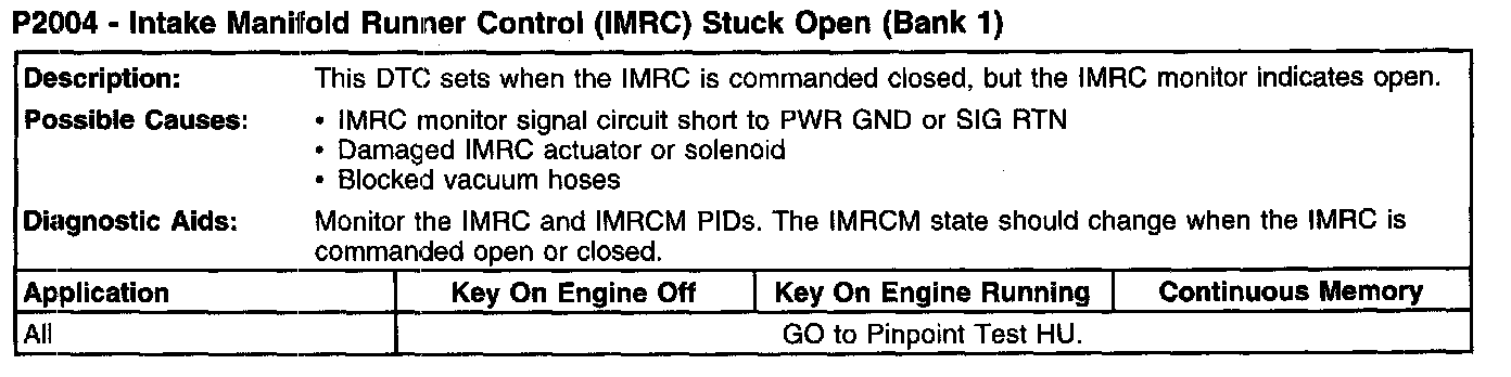 P2004 - Intake Manifold Runner Control (IMRC) Stuck Open (Bank 1):