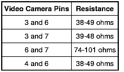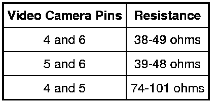 If the resistance values for the video camera are within the specifications listed, the video camera is functional at this time.