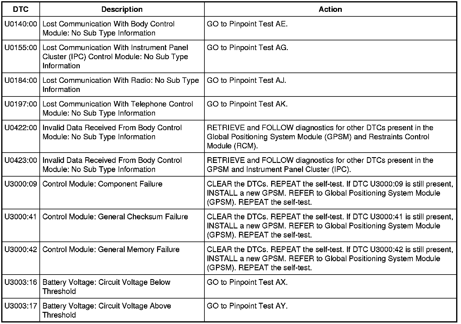Global Positioning System Module (GPSM) DTC Chart