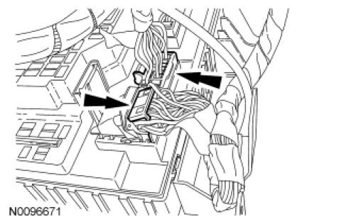10. Disconnect the small gray and the black electrical connectors from the Smart Junction Box (SJB).