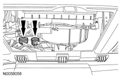13. Fully lower the glove compartment door and disconnect the 2 A/C electrical connectors.