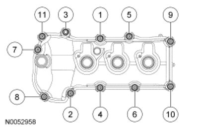 NOTICE: Early build engines have 11 fastener valve covers, late built engines have 9 fastener valve covers. Do not attempt to install bolts in the 2 empty late build valve cover holes or damage to the valve cover will occur.