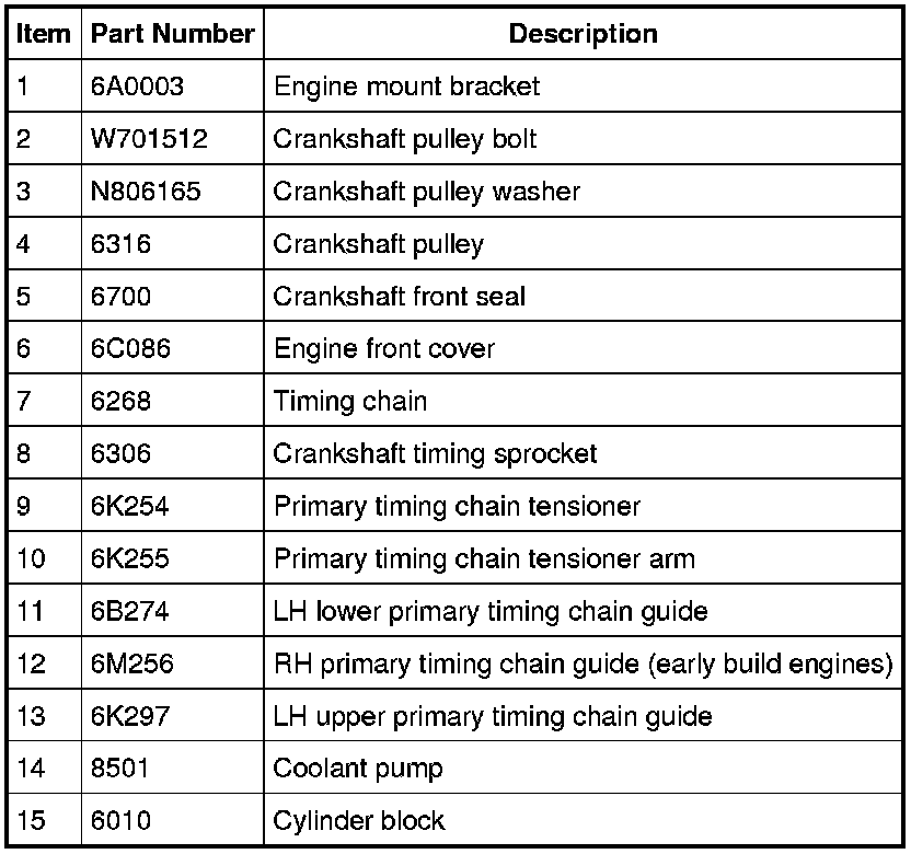 NOTE: On early build engines, the timing chain rides on the inner side of the RH timing chain guide. Late build engines are equipped with a different design RH timing chain guide that requires the timing chain to ride on the outer side of the RH timing chain guide. For service, all replacement RH timing chain guides will be the late build design.