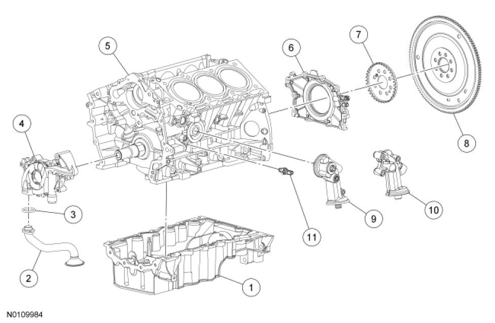82. NOTICE: Do not expose the Motorcraft High Performance Engine RTV Silicone to engine oil for at least 90 minutes after installing the engine front cover. Failure to follow this instruction may cause oil leakage.