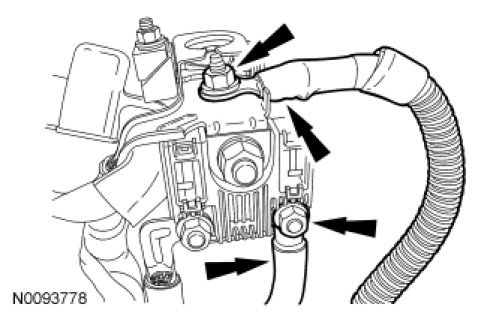 91. Install the 2 battery cables to the positive battery cable and the 2 nuts.