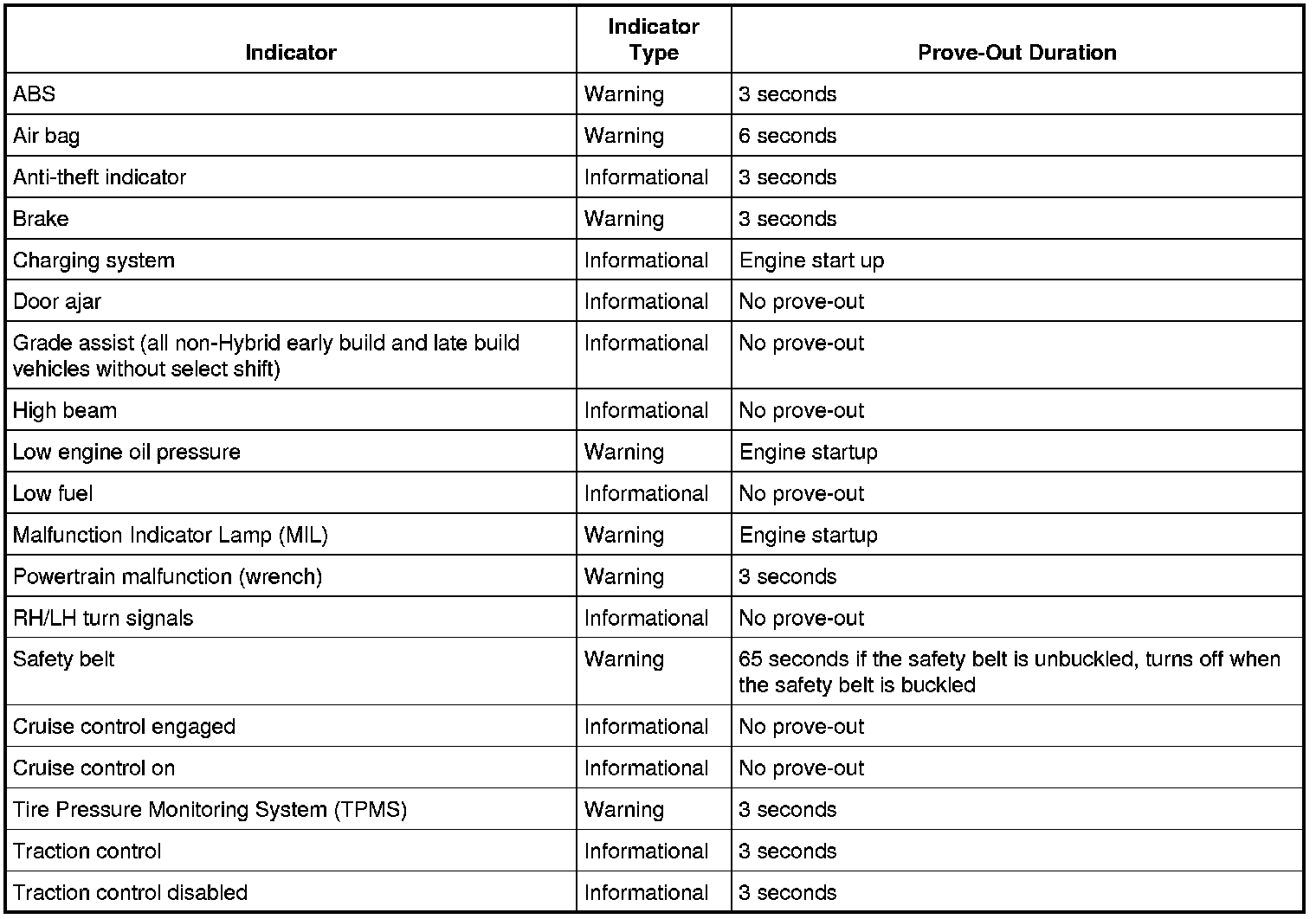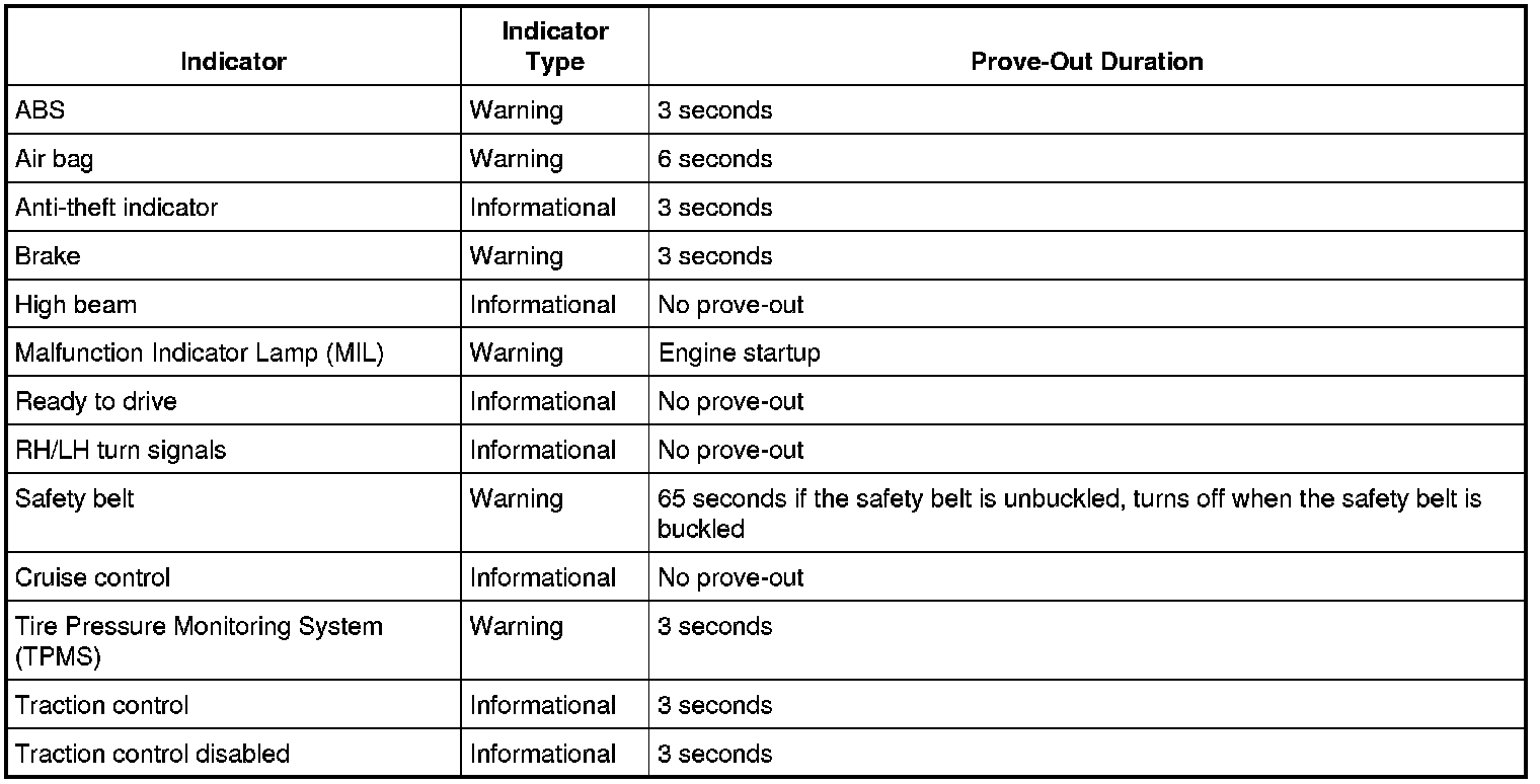 The IPC carries out a display prove-out to verify that all module controlled warning/indicator lamps and monitored systems are functioning correctly within the IPC. When the ignition is in the ON mode with the engine off, the indicators illuminate to prove-out according to the following table: