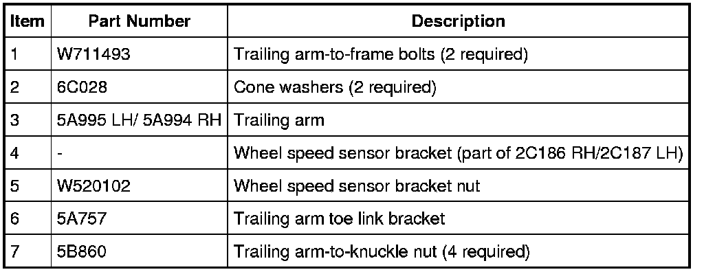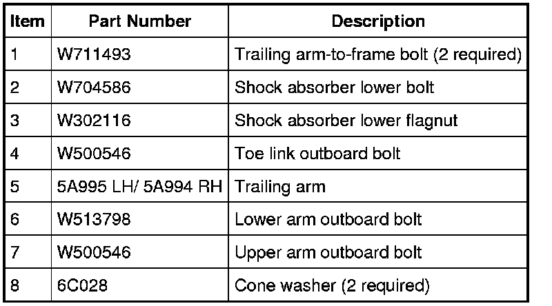 14. Remove the 2 trailing arm-to-frame bolts, cone washers and the trailing arm.