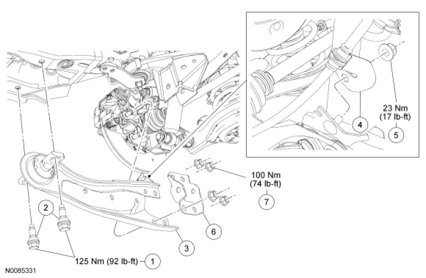 - To install, tighten the new bolt to 110 Nm (81 lb-ft) with the suspension at the bushing fastener tightening position.