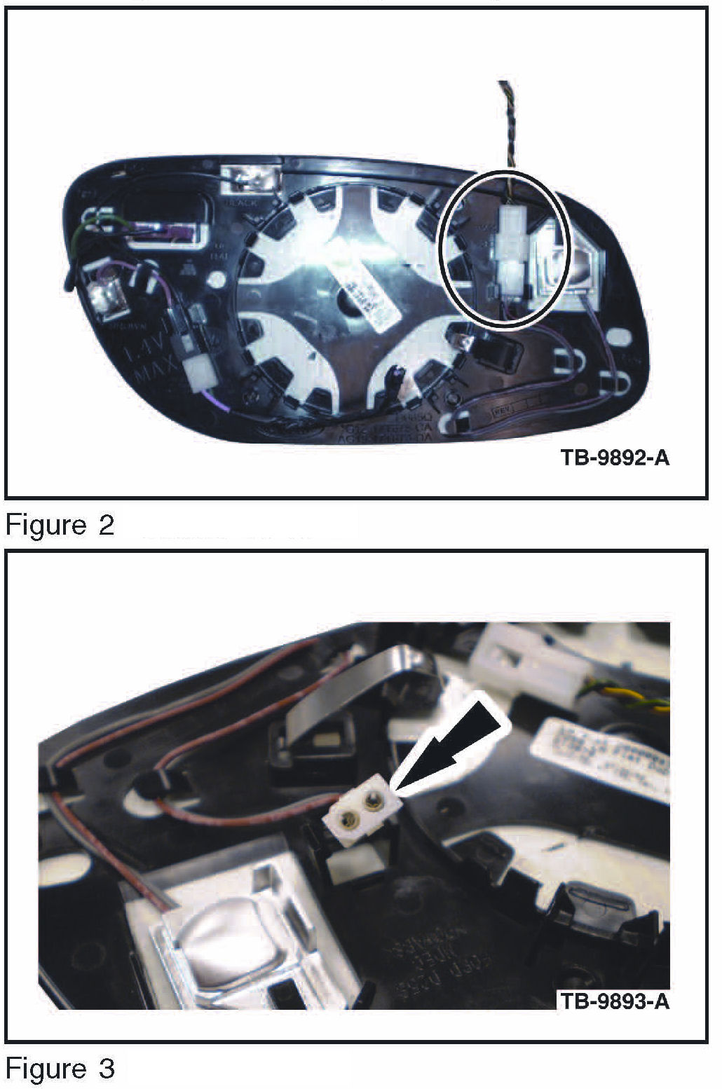 6. Inspect the BLIS exterior rear view mirrors glass subassembly connectors for spread or damaged terminals. (Figures 2-3):