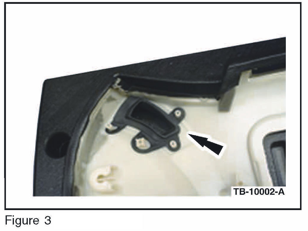 a. Position the demister grommet seal on door panel substrate, inserting first the bottom section on the substrate pins, then on the upper substrate pin. (Figure 3)