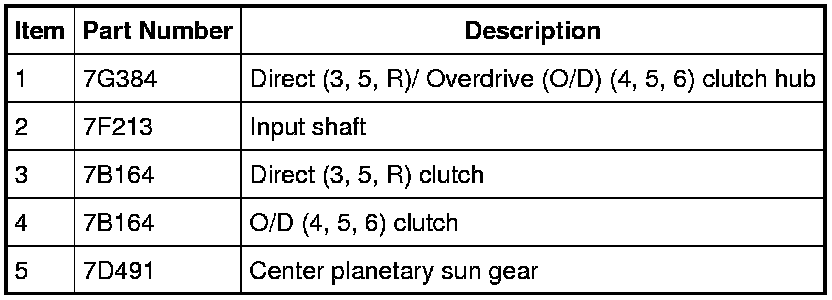 The input shaft is part of the direct/O/D clutch assembly and is splined to the torque converter turbine and the center planetary sun gear. The input shaft transfers power from the torque converter to the rear planetary gearset through the center planetary sun gear and the direct (3, 5, R) and O/D (4, 5, 6) clutches.