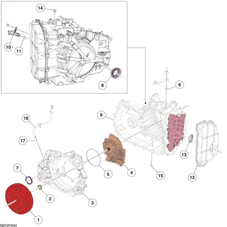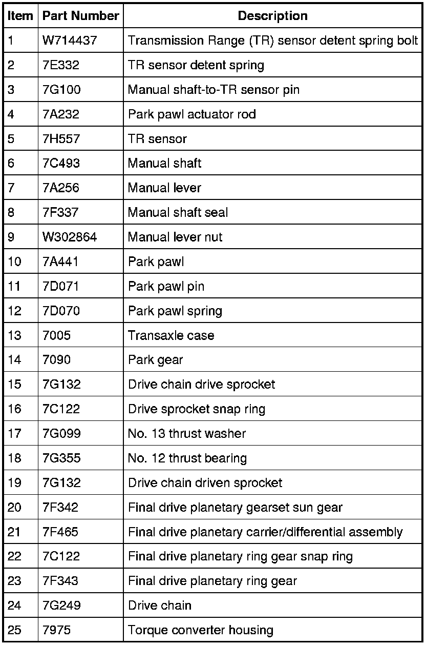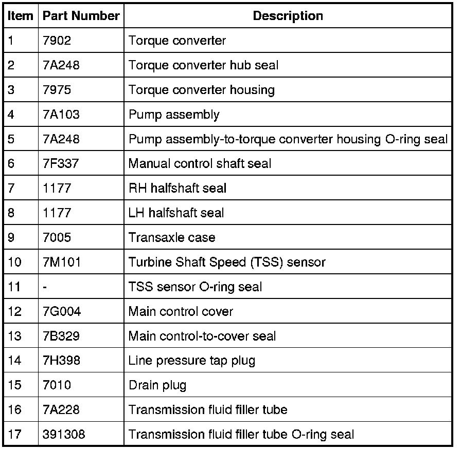 The torque converter housing has a lip-type seal that seals the torque converter hub. The pump assembly seals to the torque converter housing with a rubber seal. The manual shaft and halfshafts also use lip-type seals. All-Wheel Drive (AWD) vehicles do not use a RH halfshaft seal, the transaxle is sealed by the Power Transfer Unit (PTU) on the RH side.