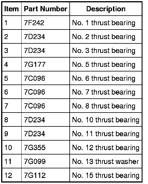 The No. 4 thrust bearing is part of the rear planetary carrier assembly. The No. 9 thrust bearing is part of the front planetary carrier assembly. The No. 14 thrust bearing is part of the differential assembly.
