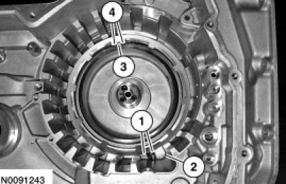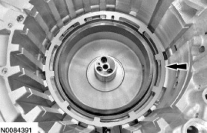 17. NOTICE: Be sure the snap ring is aligned with the gap facing the front of the transaxle or damage to the transaxle can occur. The front of the transaxle is where the low/reverse and forward (1, 2, 3, 4) clutch hydraulic ports are located.