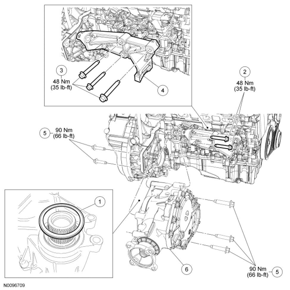 1. Tighten the bolts to the PTU to 48 Nm (35 lb-ft).