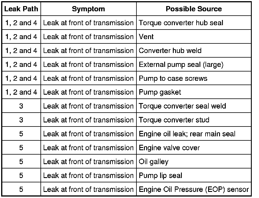 Leakage at the front of transmission, as evidenced by transmission fluid around the torque converter housing part of the case, may have several sources. By careful observation it is possible, in many instances, to pinpoint the source of a leak before removing the transmission from the vehicle. The paths which the transmission fluid takes to reach the bottom of the torque converter housing are shown in the illustration. The 5 numbers in the illustration correspond with the 5 flow path steps.