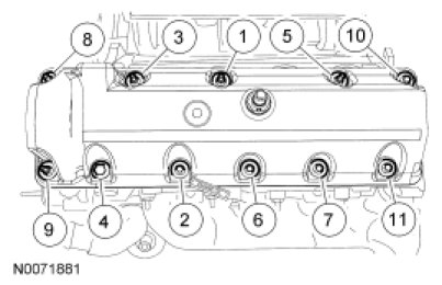 78. Install the new RH gasket into the valve cover and position on the cylinder head. Tighten the 11 bolts in the sequence shown.